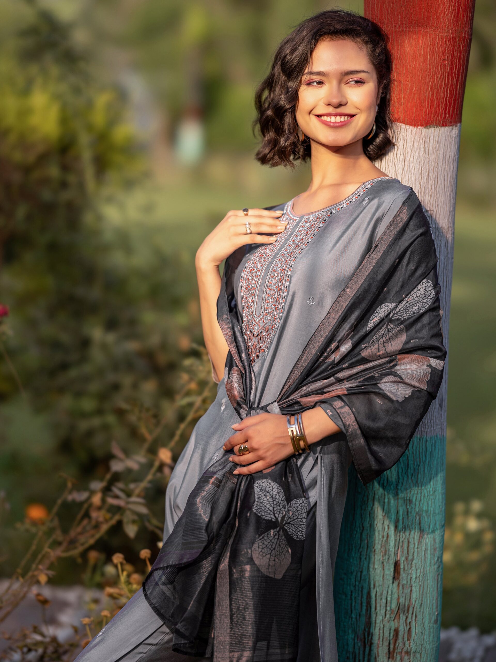 Be the first to review “Grey Embroidered Silk Blend Straight Suite”