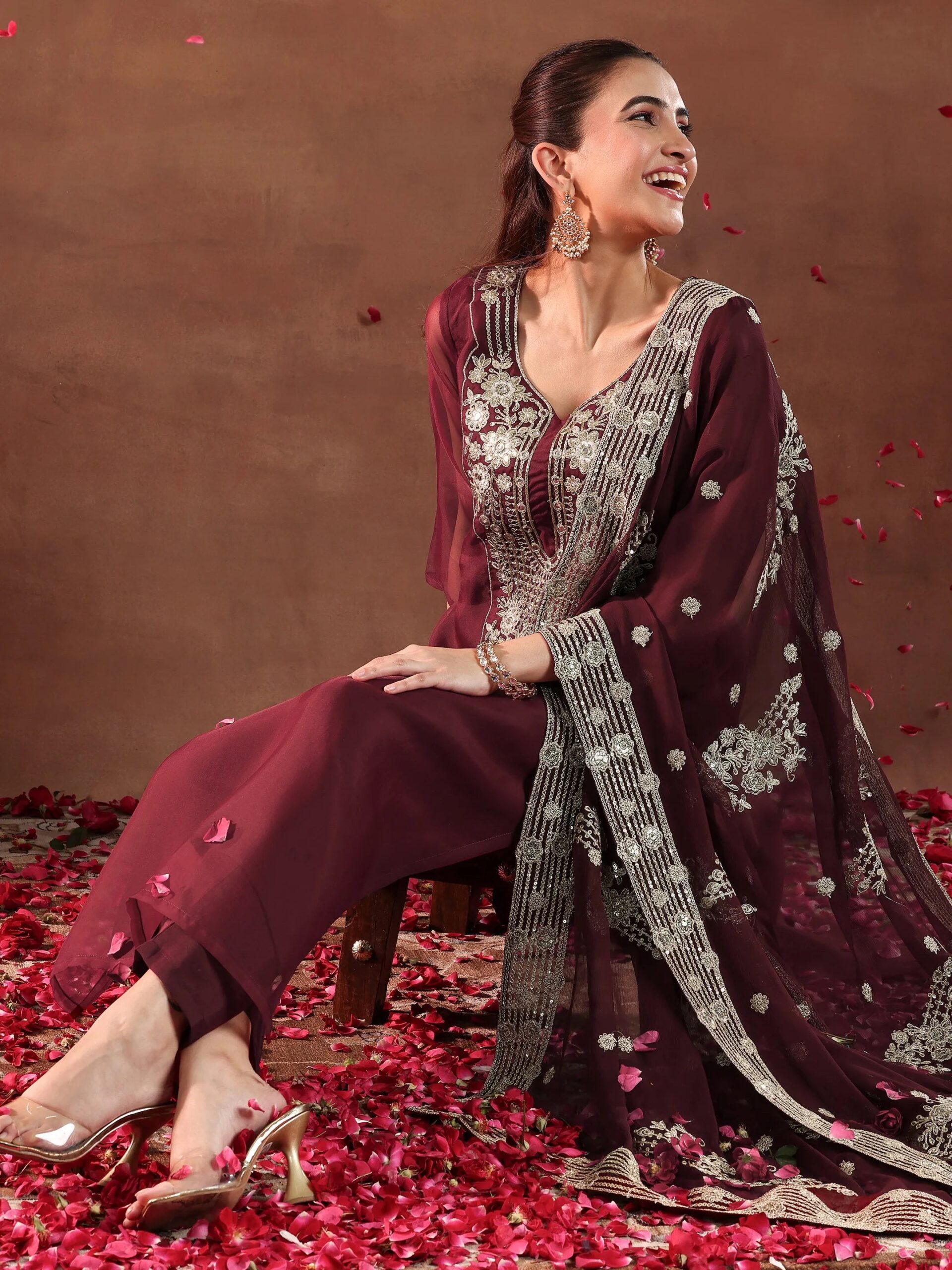 Maroon Yoke Design Organza Straight Suit