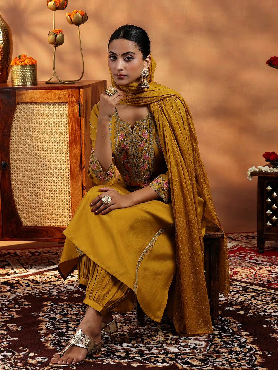 Be the first to review “Mustard Embroidered Silk Blend A-Line Kurti”