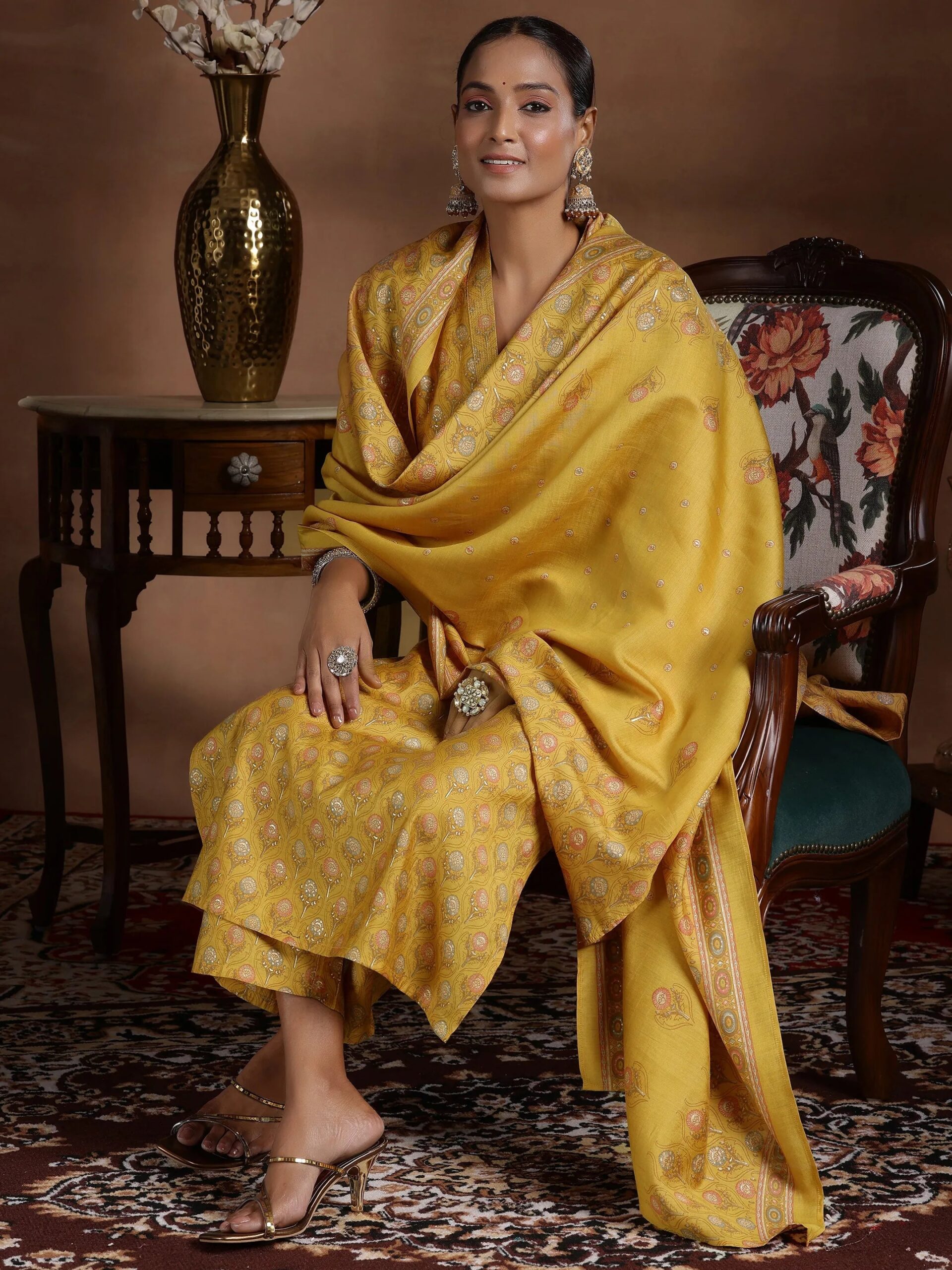 Mustard Printed Silk Blend Straight Suit