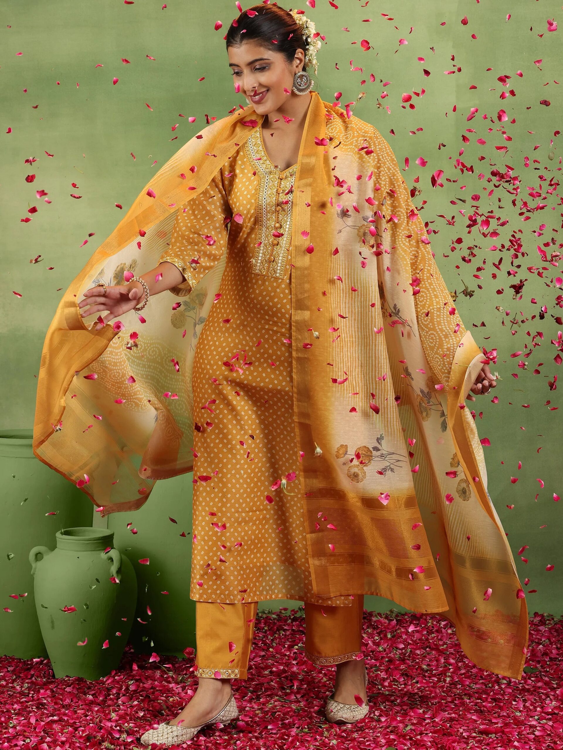 Be the first to review “Mustard Printed Silk Blend Straight Suit”