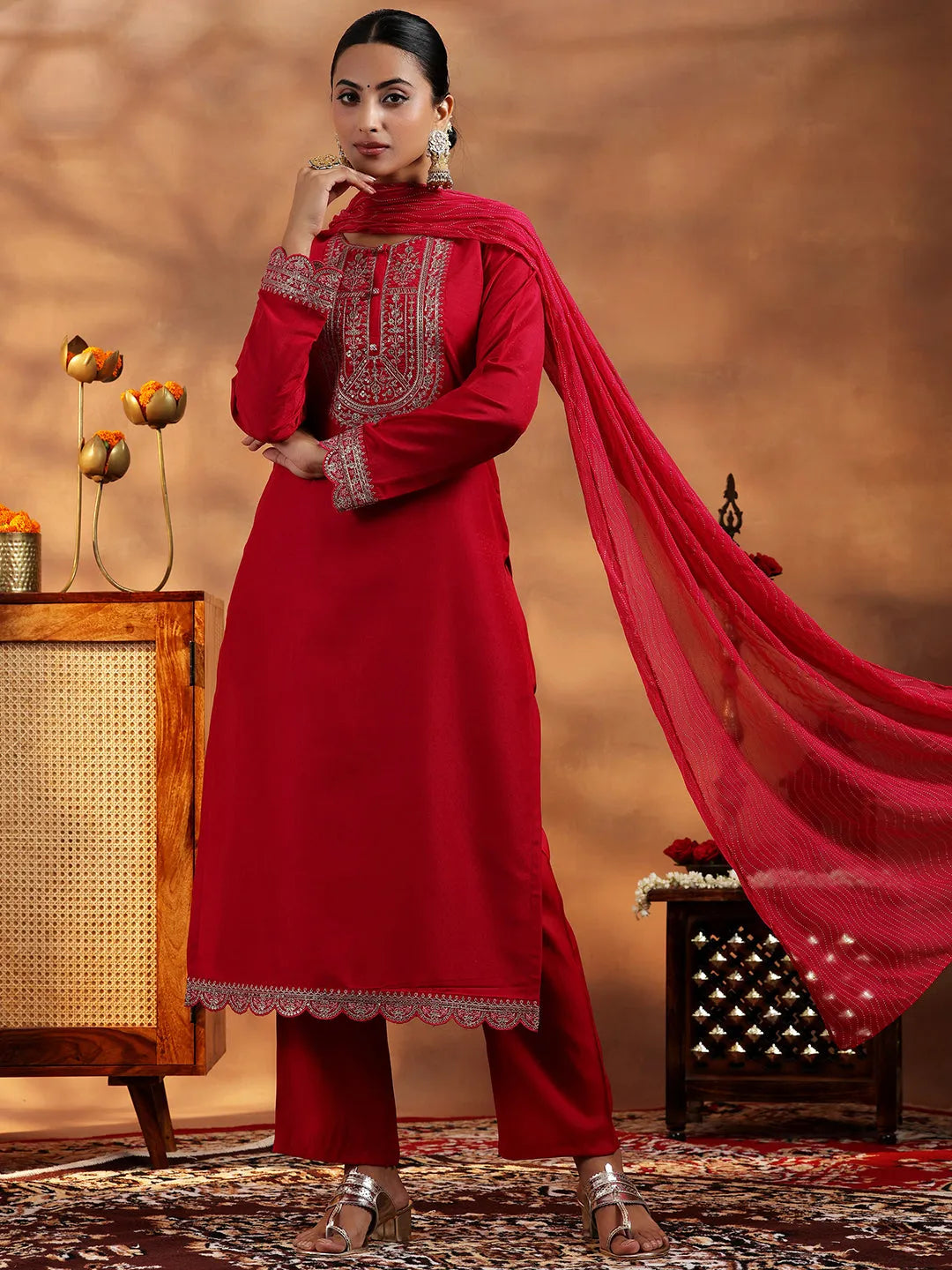 Pink Embroidered Silk Blend Straight Suite