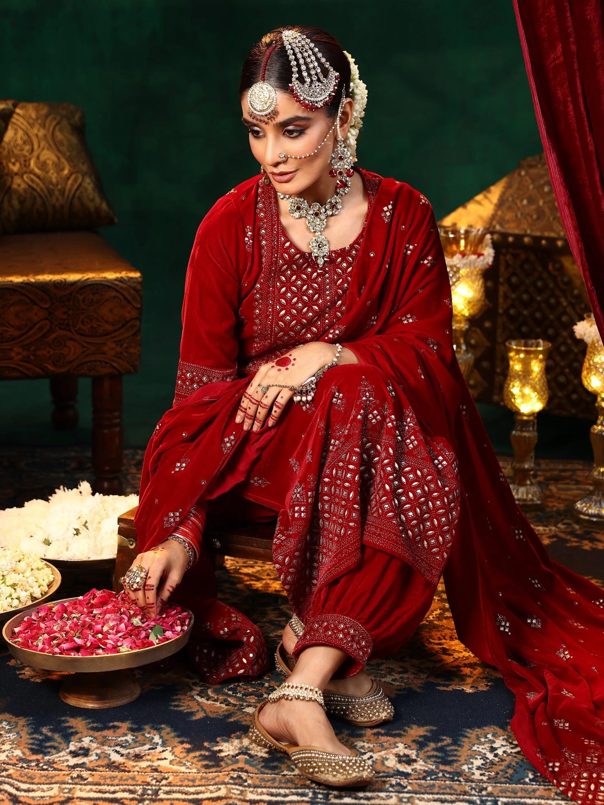 Be the first to review “Red Embroidered Velvet Straight Suit With Bottom”