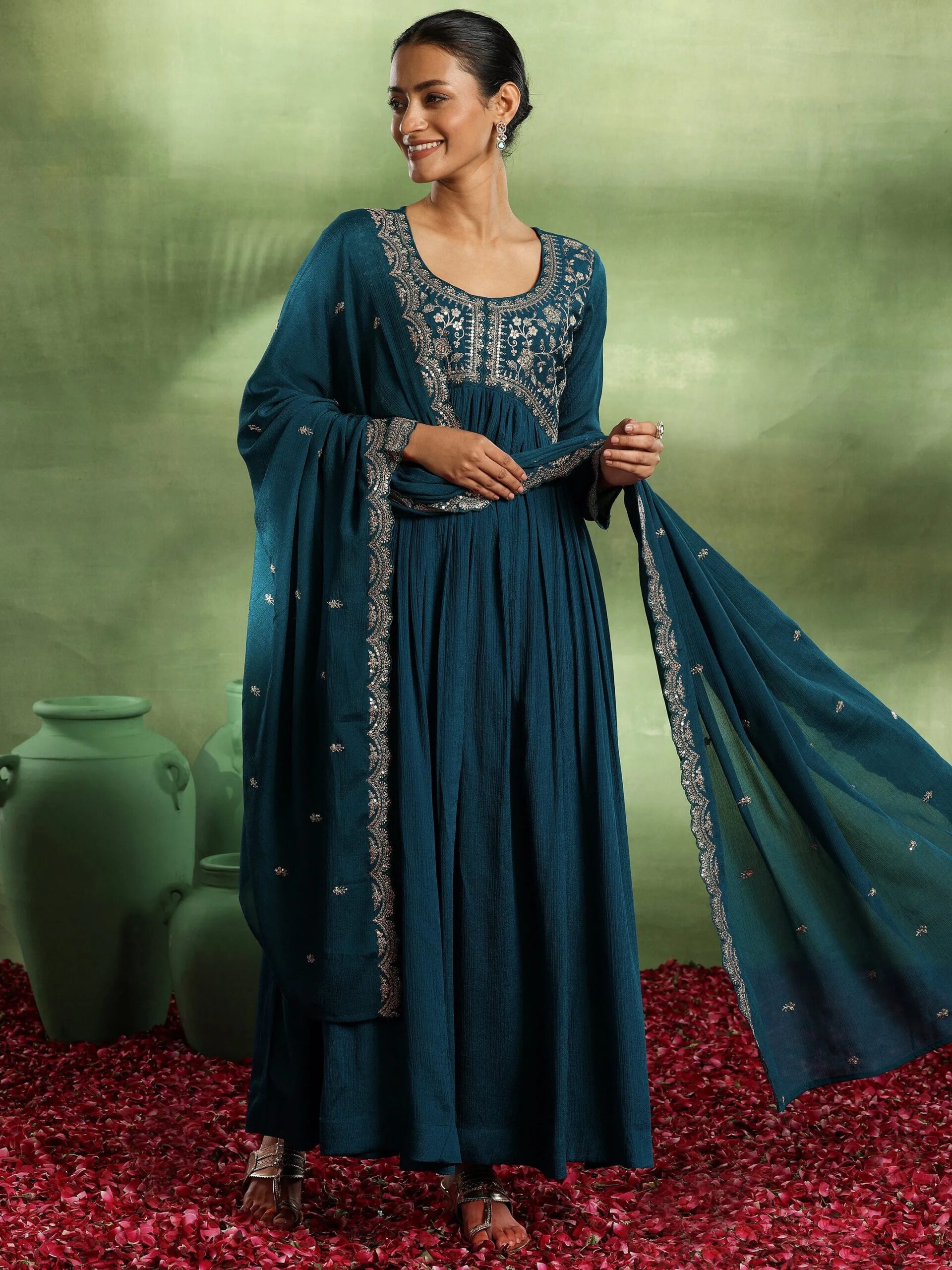Be the first to review “Teal Yoke Design Silk Blend A-Line Kurti”