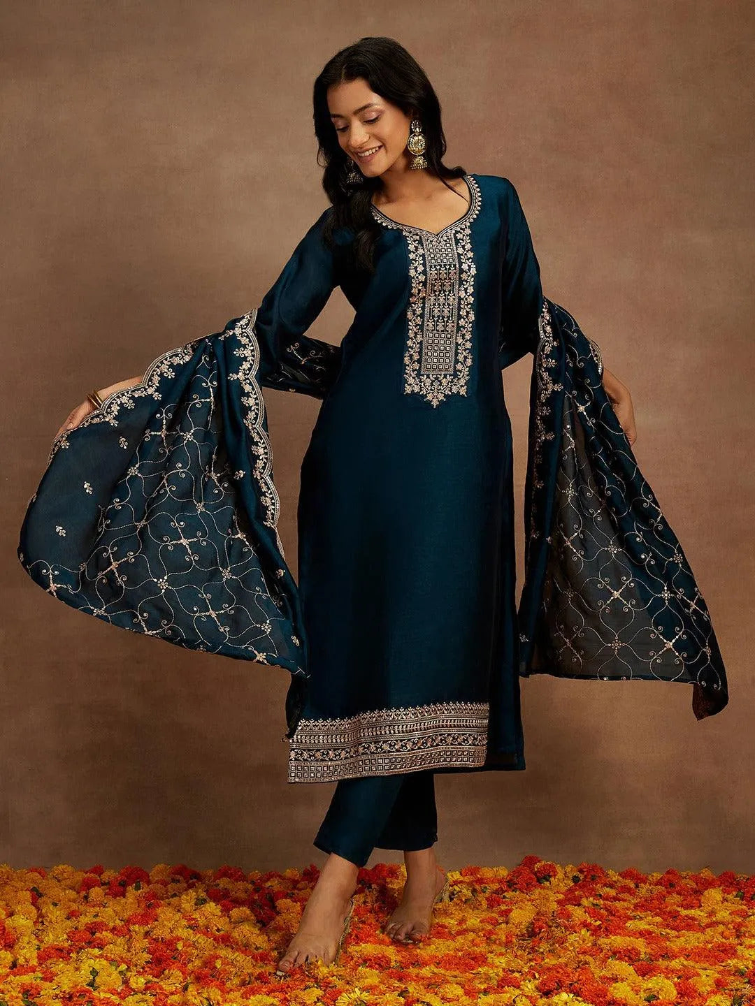 Teal Yoke Design Silk Blend Straight Suite