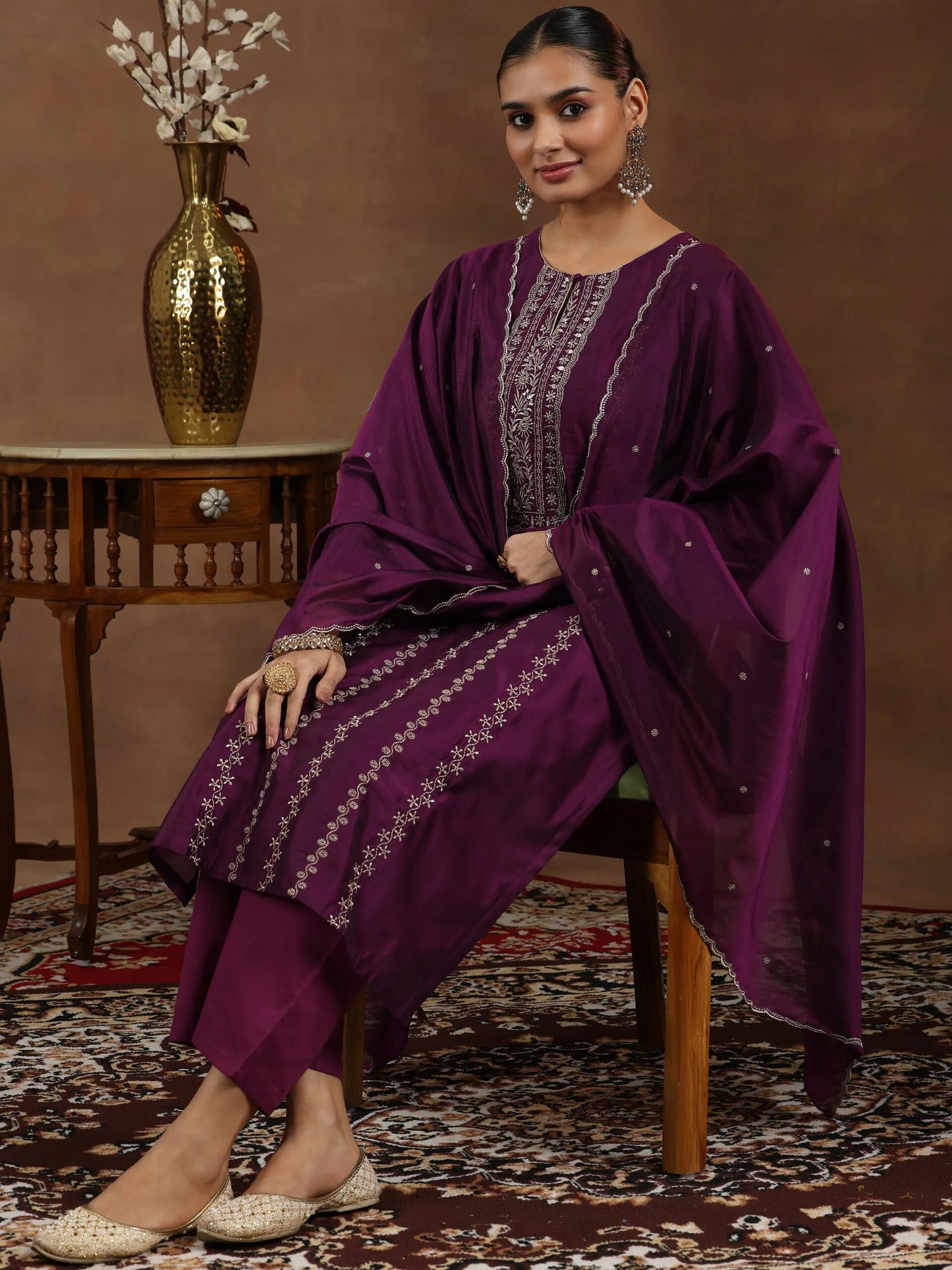 Wine Embroidered Chanderi Silk Straight