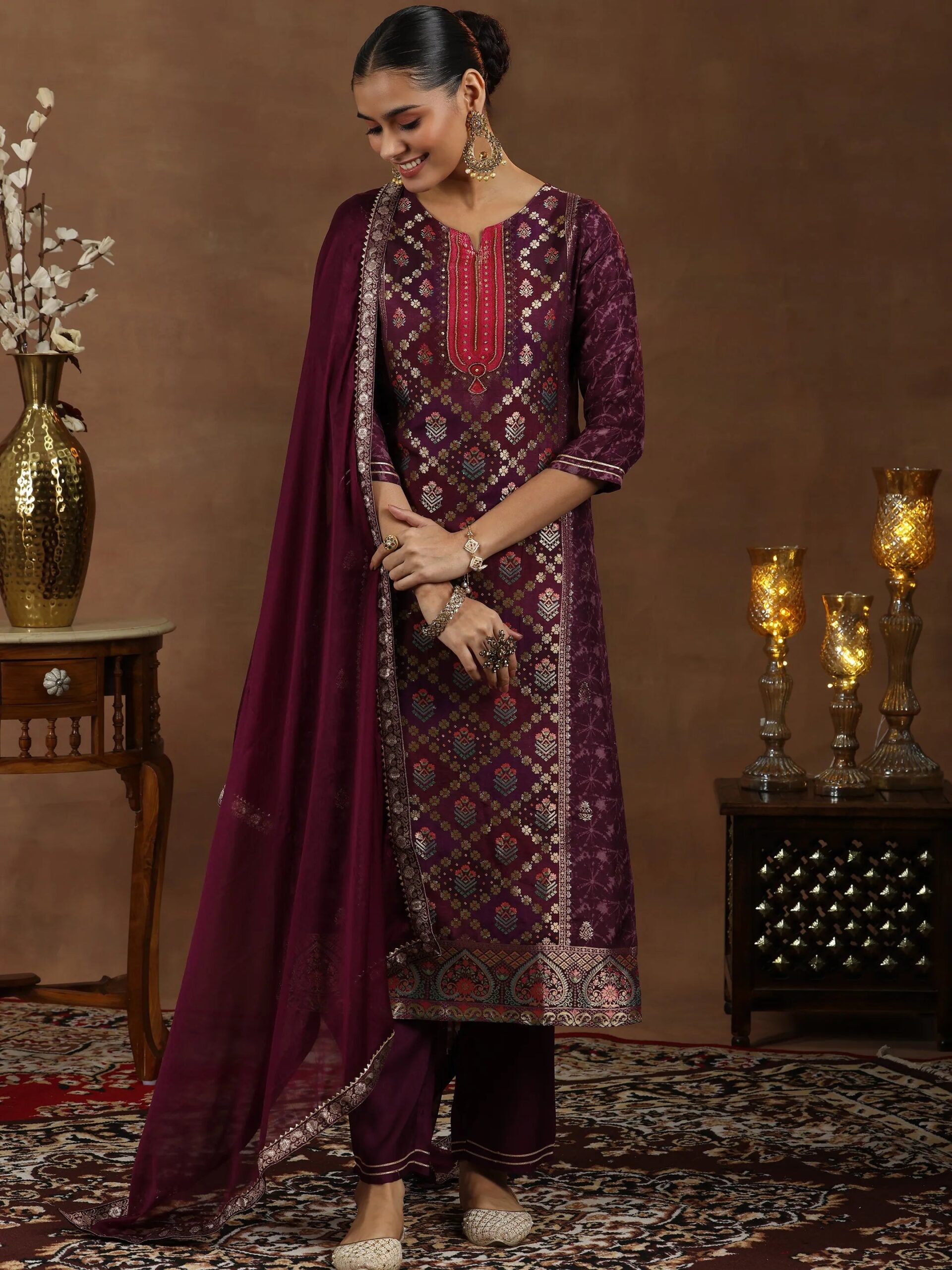 Wine Woven Design Silk Blend Straight Suite